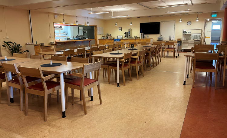 Det innebär bland annat att matsalen och köket har flyttat till vår ”nya” tillfälliga matsal i källaren på hus 11. Matsalen är nu i cafeterian utanför Baldursalen och köket har flyttat in i den tidigare cafeteriaserveringen. En del anpassningar har gjorts i utrymmet för att verksamheten ska kunna tillaga och servera till exempel frukost, fika och sallad. Eleverna får sin lunch och middag via catering från sjukhusets restaurang.