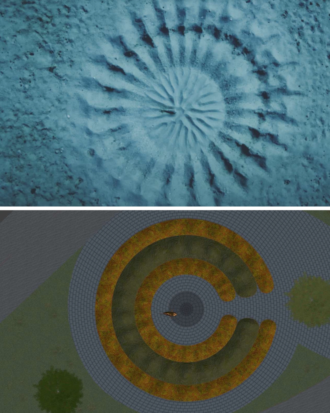 Under skissarbetet blev Shamma starkt berörd av en dokumentär om blåsfisken, vars hanar skapar intrikata mönster i sanden för att locka en partner. Detta mönster, skapat i livets tjänst, påminner om hur vi alla är en del av ett större system och kretslopp. För att fördjupa sin förståelse för hur naturens mönster påverkar oss, kontaktade hon Caroline Hägerhäll, professor i landskapsarkitektur. Hägerhälls forskning visar att självupprepande mönster, som de vi ser i trädens grenar eller vågorna på havet, har en stimulerande effekt på vår hjärna och främjar återhämtning samt välmående.