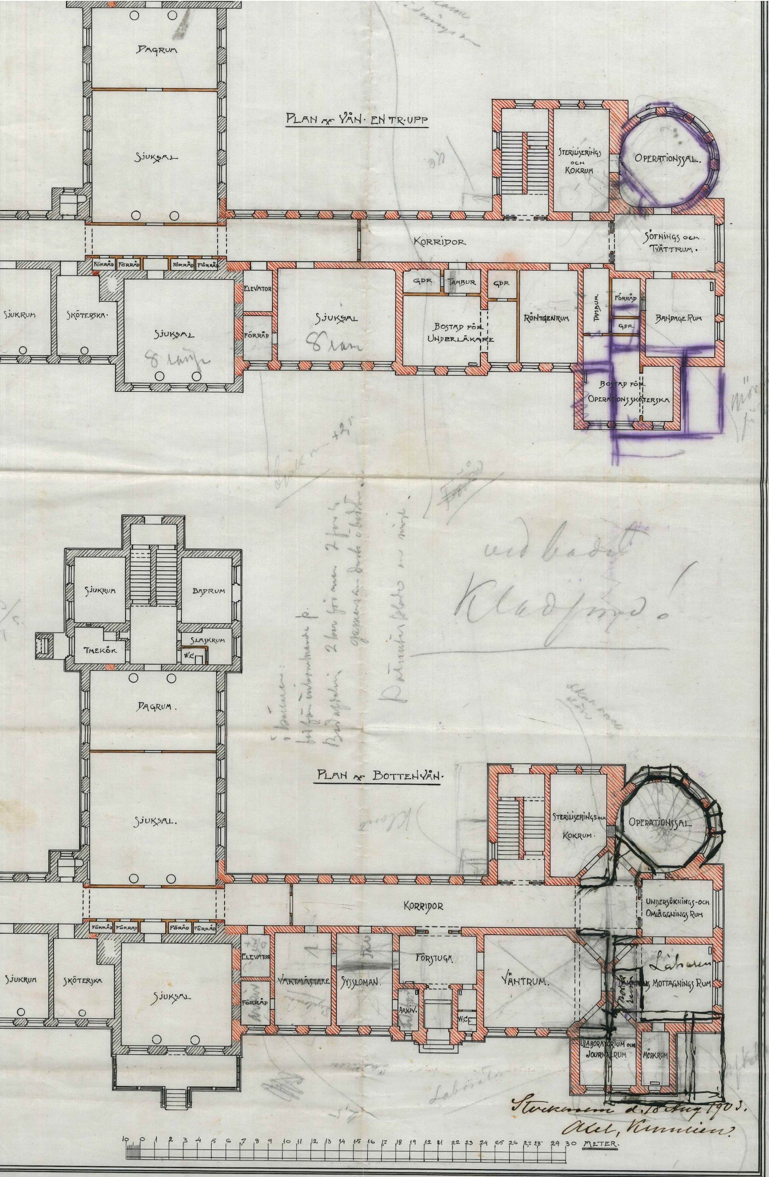 Regionarkivet har ett omfattande bestånd av ritningar från alla regionens verksamheter, daterade från 1800-talet till 2000-tal. Bland ritningarna finns inte bara lasaretten, sjukhusen och hälsocentralerna – här finns också skolor, ekonomibyggnader, avloppsystem, hissar och mycket annat. De tidiga ritningarna vittnar om ett otroligt handarbete, med mycket detaljer och vackra handstilar. Genom decennierna blir stilen stramare, både i arkitekturen och ritningarnas utformning, men visar likväl på kreativitet och handens uttryck.