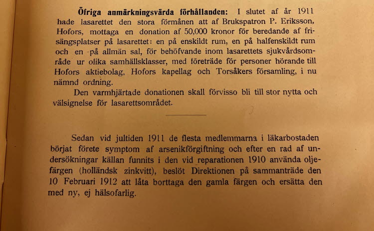 Innan Helga lämnade lasarettet kan hon ha varit inblandad i en förgiftningsincident. Gefle lasaretts årsberättelse från 1912 berättar om hur de boende i den så kallade läkarbostaden började uppvisa symtom på arsenikförgiftning omkring juletid 1911. Det är oklart om man med ”läkarbostaden” menar den gamla läkarvillan Carlsborg som Regionarkivet tidigare berättat om i Månadens fotografi från sommaren 2023, eller någon annan byggnad på sjukhusområdet tillägnad underläkarna. Det är även oklart om Helga bodde på sjukhusområdet vid den här tiden. Av årsberättelsen framgår att de boende blivit arsenikförgiftade av hälsofarlig målarfärg.