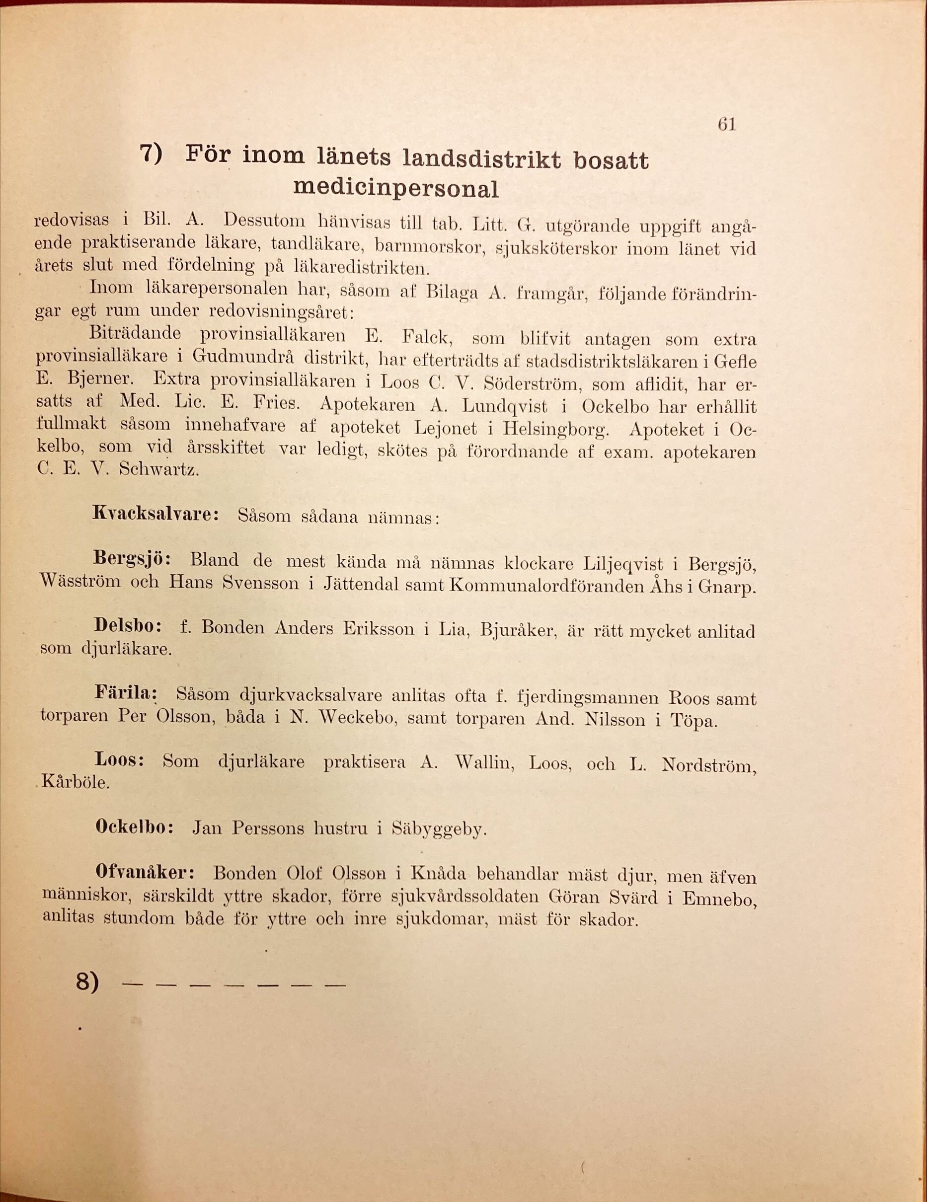 I ”Förste provinsialläkarens årsberättelse över hälso- och sjukvården i Gävleborgs län år 1904” finns en intressant redogörelse över de kända kvacksalvare som provinsialläkarna i distrikten rapporterat om. Bland kvacksalvare i Bergsjö distrikt listas bland ”de mest kända” herr kommunalordförande Åhs i Gnarp – en man med makt, kan vi tänka oss. Men kommunalordförande eller ej, en kvacksalvare skulle föras in den statliga statistiken. Så även i Gnarp.