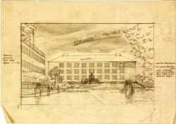 Ritningen visar den så kallade ”Röda gården” på Helsingegårdens lanthushållsskola i Järvsö. Skolans grundare och föreståndarinna var Agnes Sundberg, som våren 1918 tog över hemmanet Ol-Ols i Kåsjö. På den lite förfallna hälsingegården startade hon den lanthushållsskola hon länge drömt om att driva och utveckla. Gården bestod från början bara av en huvudbyggnad och en ladugård, och det var i huvudbyggnaden, kallad ”Vita gården”, som både undervisningen hölls och eleverna bodde under första kursen hösten 1918. Agnes och hennes första lärarinna Elsa Brunnström planerade tidigt för en utvidgning av verksamheten och år 1919 byggdes den stora ladugården om till elevhem och fick namnet ”Röda gården”.