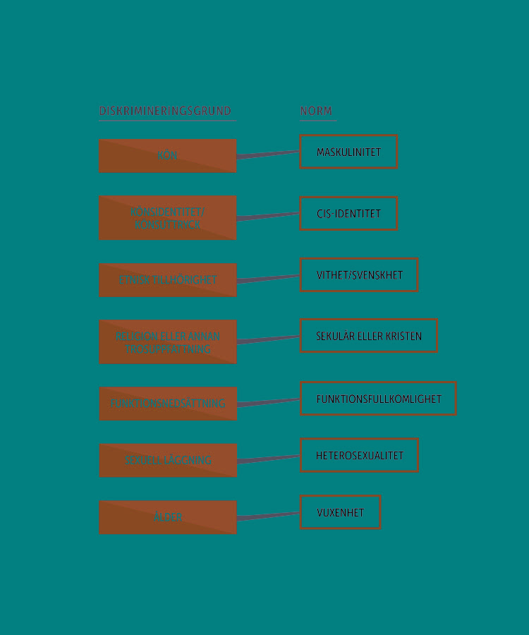 Bilden visar de olika diskrimineringsgrunderna och vilken norm som, på samhällsnivå, är den dominerande. Att inte tillhöra den dominerande normen kan vara begränsande.